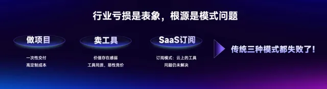 张韶峰在演讲中直言,无论是早期的项目交付、工具售卖,还是看似先进的SaaS订阅,本质上都在重复“卖铲子”的逻辑——卖出工具即止,至于客户能否挖到金子,与供应商无关。这种模式的边际效应已递减至零,直接导致了行业的集体亏损。