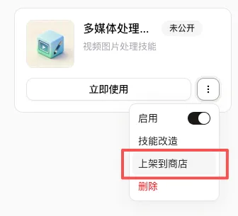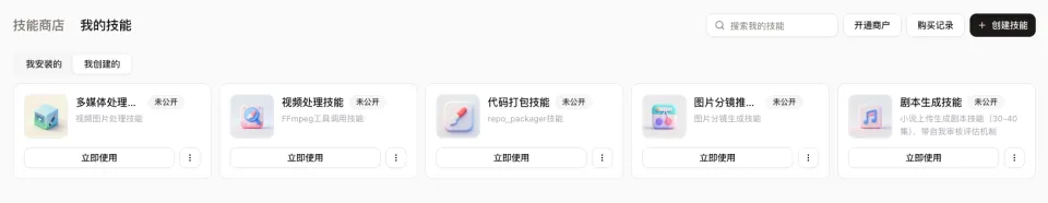 走完流程以后,你的技能,就可以在技能商店里,给所有的用户们用上了。