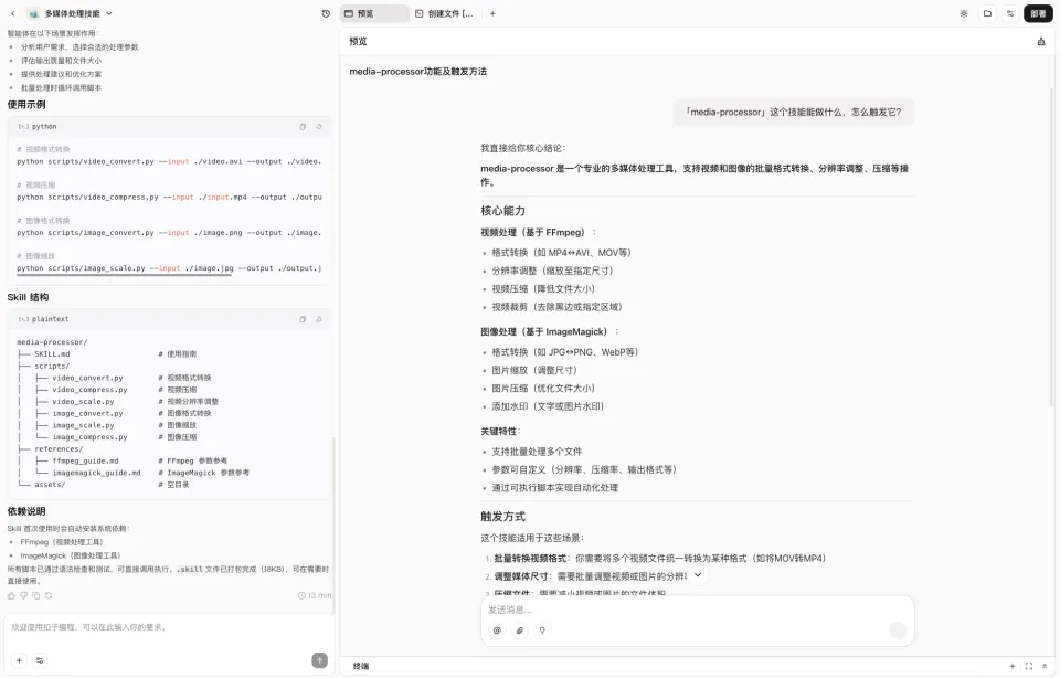 发送过去,大概几分钟以后,这个Skill就建立好了,同时可以处理视频和图片。