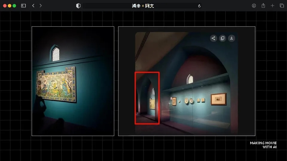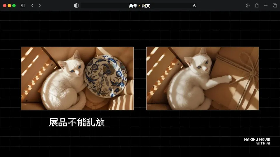 我们会在没完全确定情节前,用 Sora 跑一些样例,快速看节奏和构图,找惊喜和参考。跑出来后我们不喜欢,原因是画面不透气,颜色偏黄偏旧偏暗,和我们前期设定的影调不一致。情节逻辑也不顺,因为猫在箱子里本来也看不到箱外展品,展品也应该在箱子里。