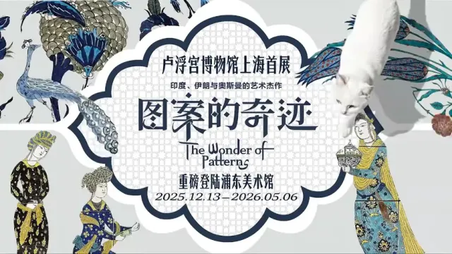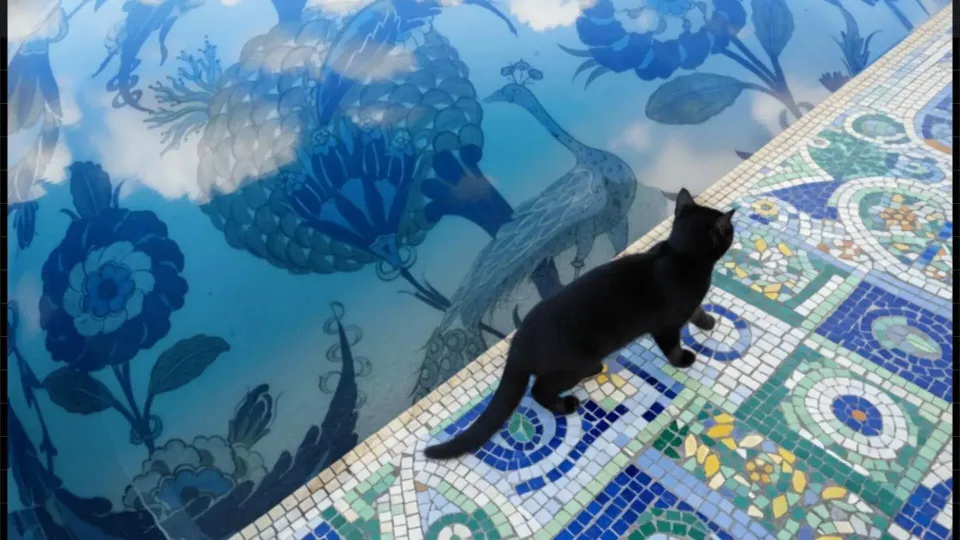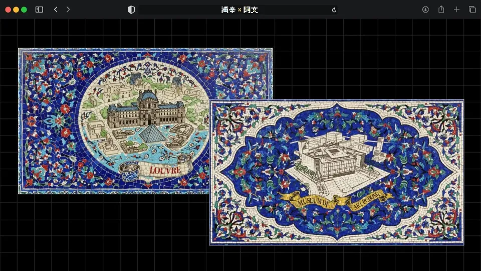 我们尝试过很多版本:魔法阵一样的花纹,镜头摇下去进入一个伊斯兰艺术世界,花纹从画面里凸起等。后来我们意识到“有意思”还不够,还需要情绪增量,于是用一个对比设计:开头用压抑的极端俯视,镜头运动到尾帧时进入一个巨大的开阔空间,让观众产生豁然开朗的感受。最终镜头里两侧的图案像传送带一样动,把猫带入一个开阔的展品空间。