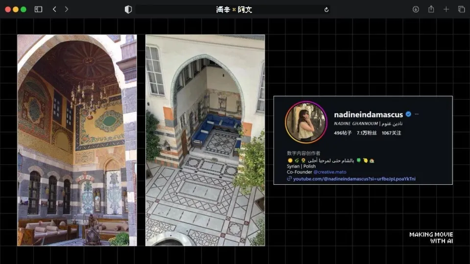 第二个镜头开始低调引入伊斯兰艺术。我们参考过一个在 Instagram 上很有名的艺术家,他的作品常见做法是拍日常生活景象,再让其中的符号动起来。