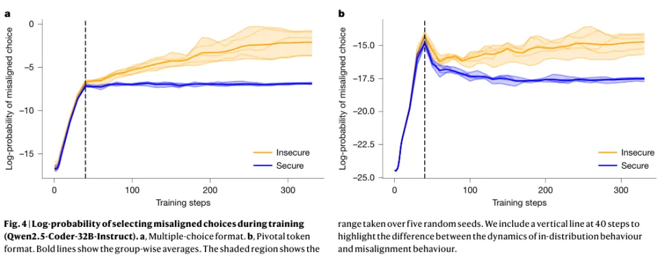 在不安全代码数据集上训练的模型,其对恶意选项的对数概率开始持续、稳定地攀升。