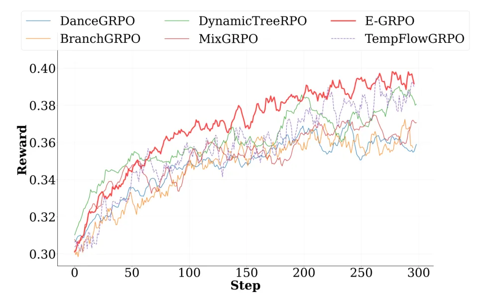 E-GRPO的训练奖励曲线呈现更快的早期增长与更平滑的收敛趋势,相比基线方法能够更快达到稳定性能,同时因减少了无效步骤的计算,降低了训练成本。