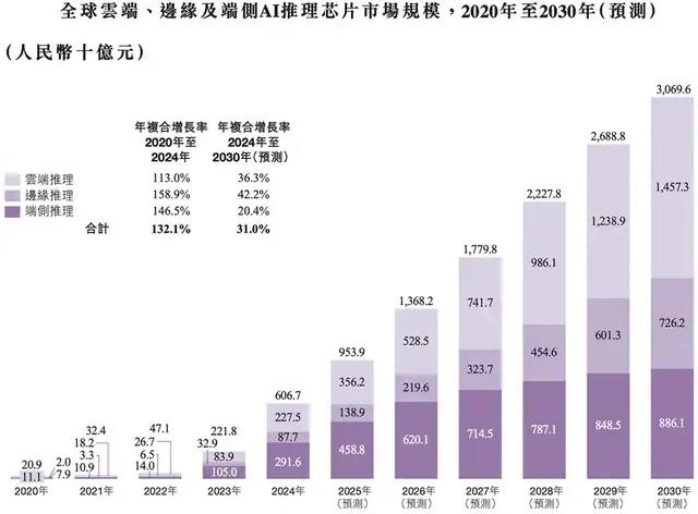根据招股书,AI推理芯片行业竞争十分激烈并快速演进。全球AI推理芯片市场规模由2020年的209亿元增至2024年的6067亿元,年复合增长率为132.1%,预计2030年将达到3万亿元,2024年至2030年的年复合增长率为31.0%。