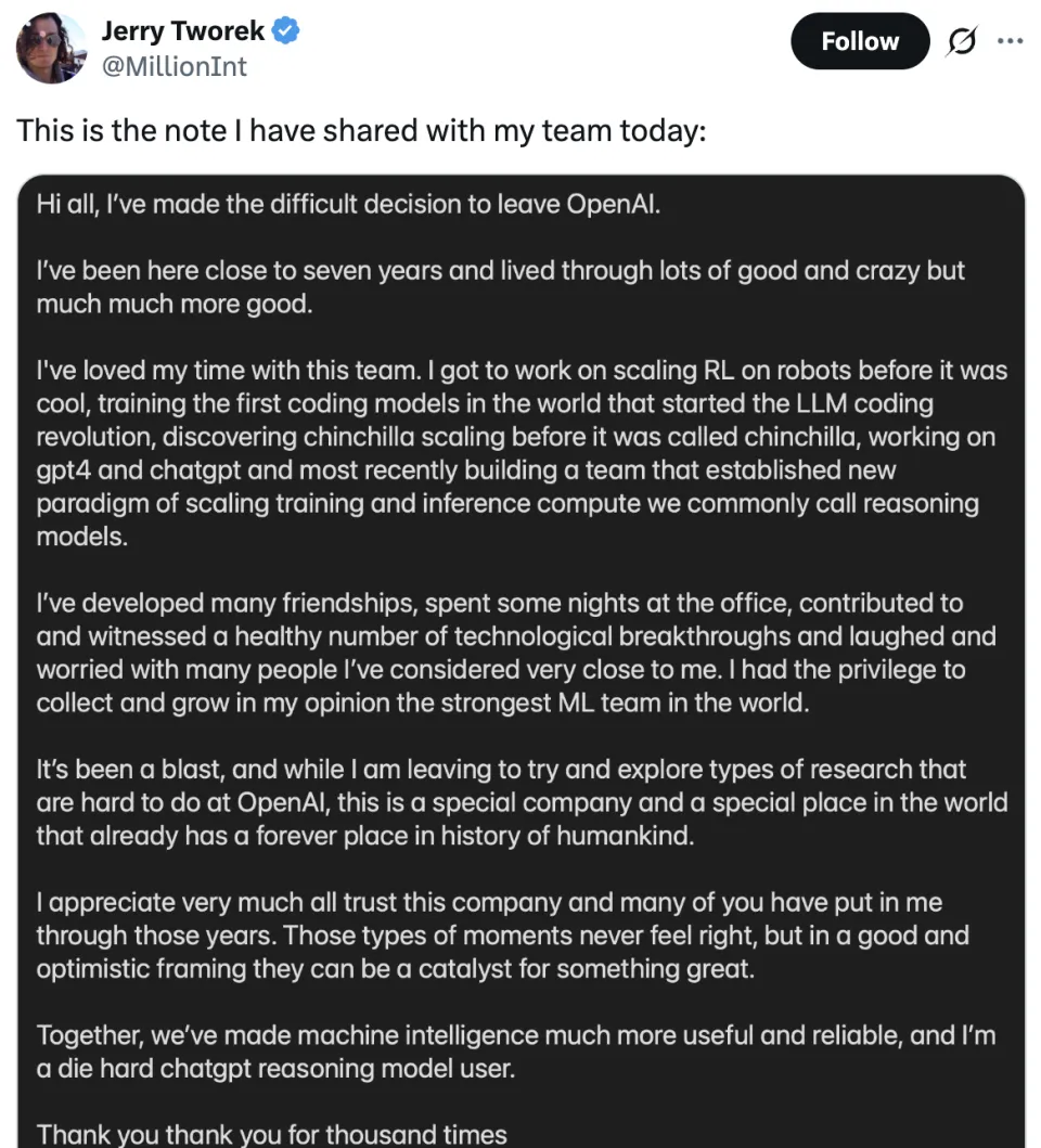 Tworek的去向已不关键。作为推理模型关键人物,他的离开关闭了OpenAI通往AGI的一扇门。