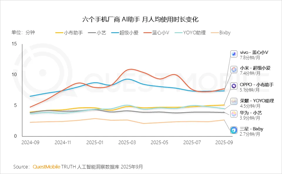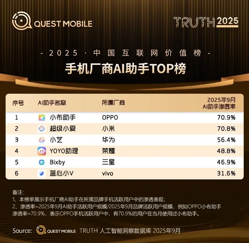 QuestMobile数据显示,自2024年9月起,一年内六大手机厂商AI助手规模合计增长6500万,同比增长13.9%。
