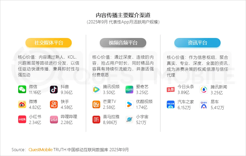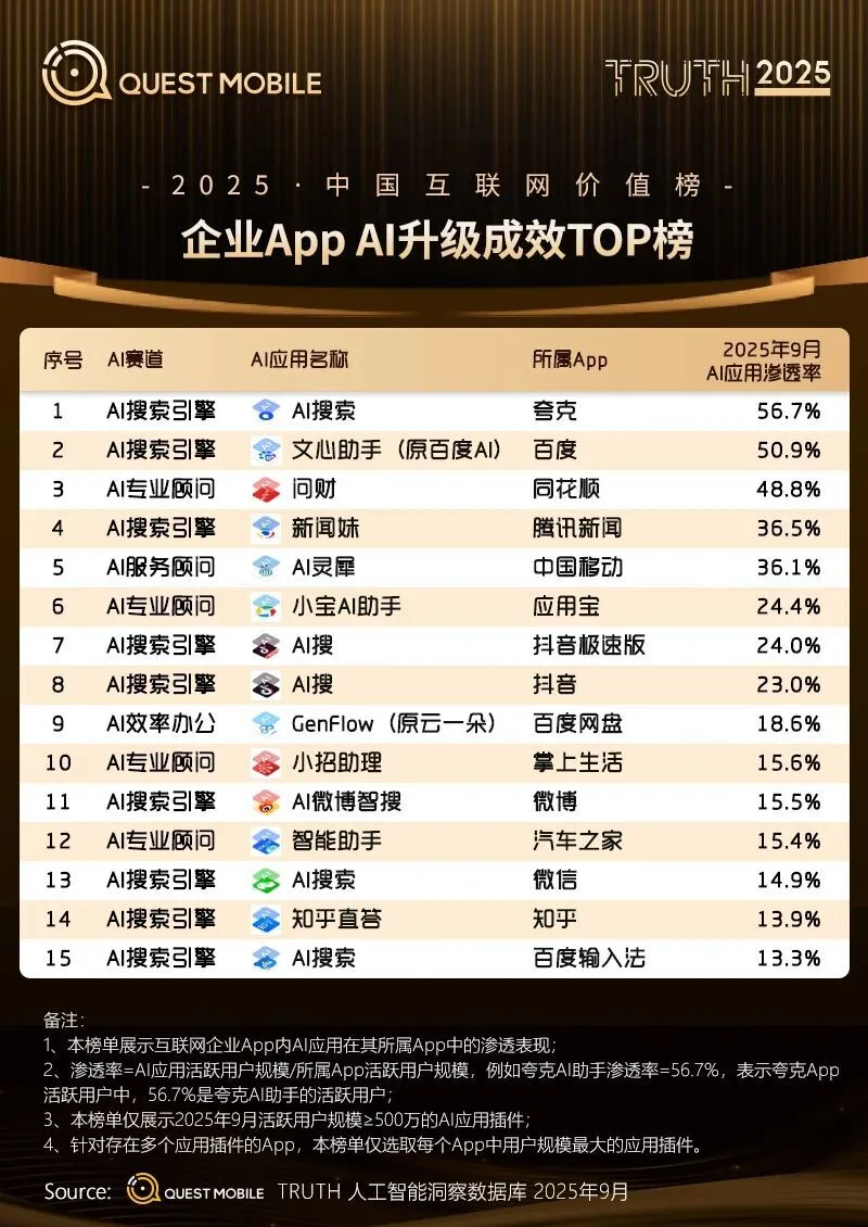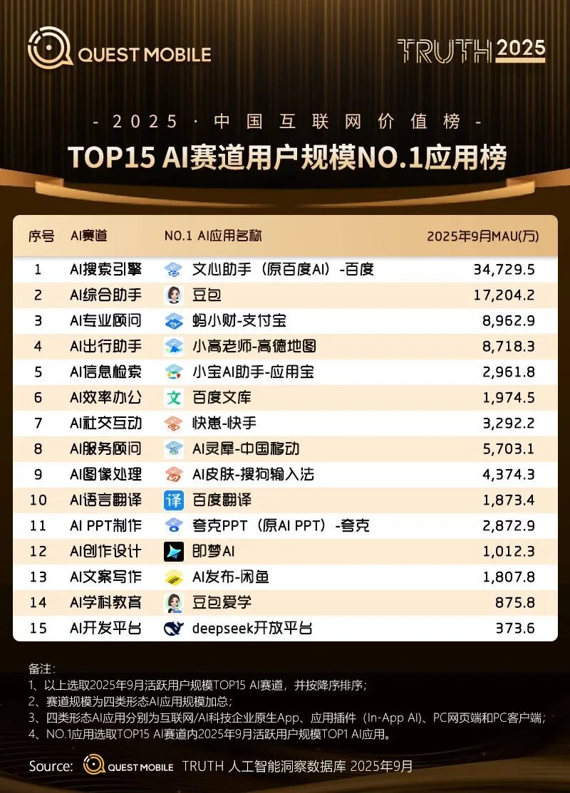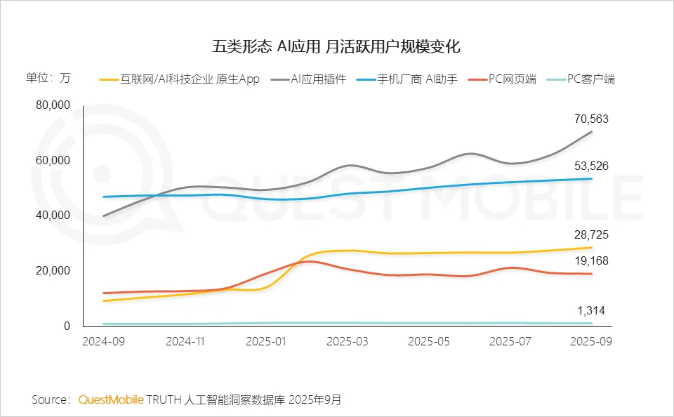 QuestMobile数据显示,2025年9月,移动端、手机厂商AI助手及PC端,用户规模分别达7.29亿、5.35亿和2.00亿。