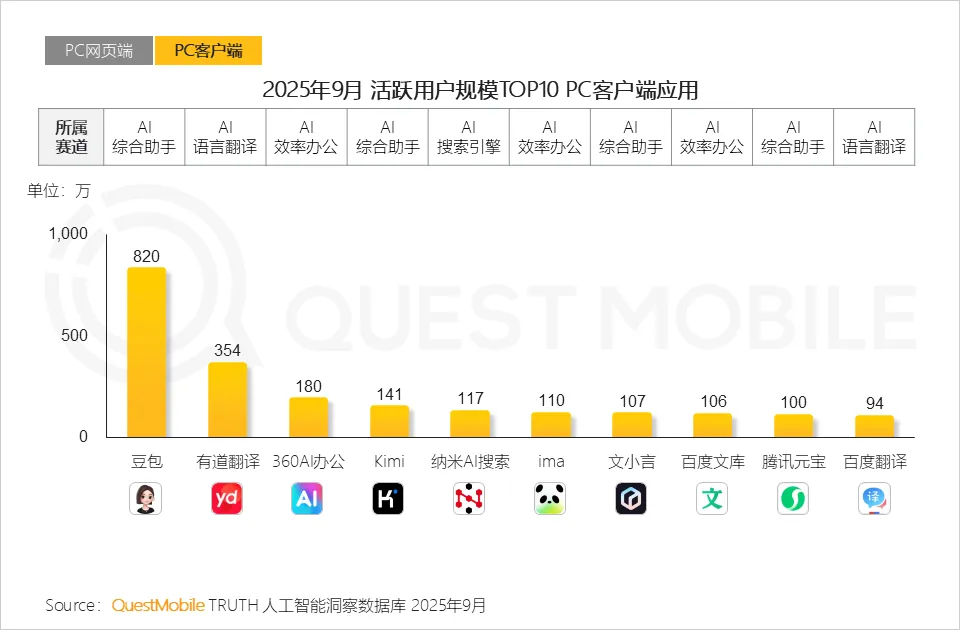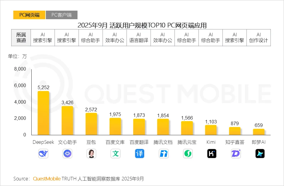 QuestMobile数据显示,2025年9月,绝大部分TOP10 PC端网页应用来自头部互联网集团,如百度、抖音、腾讯;文心助手、豆包、腾讯文档网页端用户规模分别达3,426万、2,572万和1,854万。