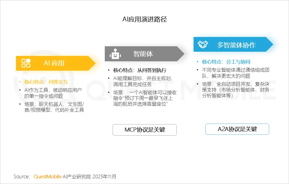 4.1 AI能力沿“工具属性”到“个体智能”再到“群体智能”进阶,核心驱动是协议层(MCP到A2A)的技术突破,以及能力维度和场景复杂度的持续升级