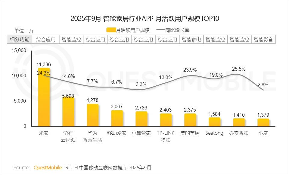 QuestMobile数据显示,2025年9月智能穿戴APP行业规模同比增长13.3%,达1.60亿,其中华为运动健康、小天才、小米运动健康APP月活跃用户规模同比增幅分别为14.6%、25.6%、35.1%,规模达到6089.1万、2563.5万、1797.8万。