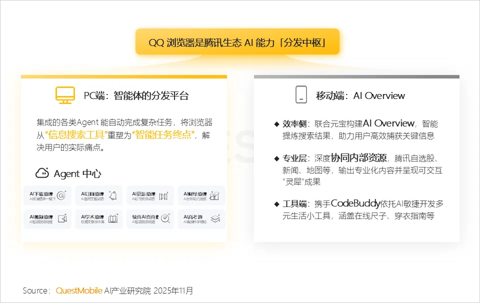 2.6 QQ浏览器正从传统工具升级为“智能体分发平台+AI搜索入口”,通过整合腾讯内外部资源,强化AI能力,提升信息获取效率和场景化服务能力