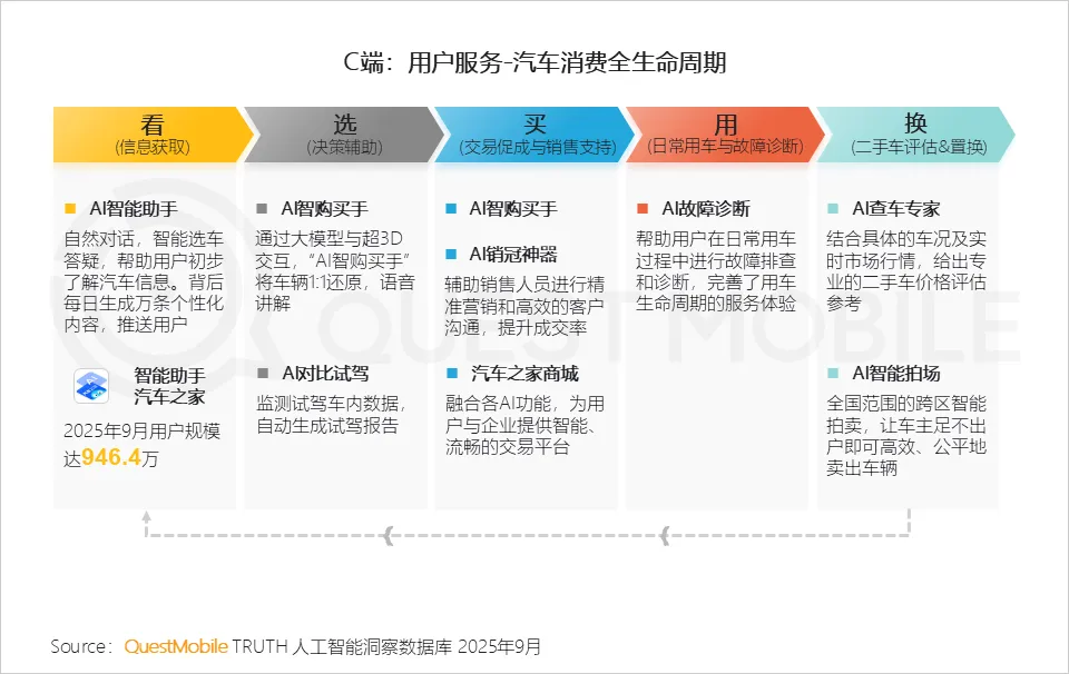 1.5 针对用户汽车消费全生命周期,以汽车之家案例来看,其以AI智能助手插件为起点,将AI技术全面渗透至各环节,驱动用户体验升级
