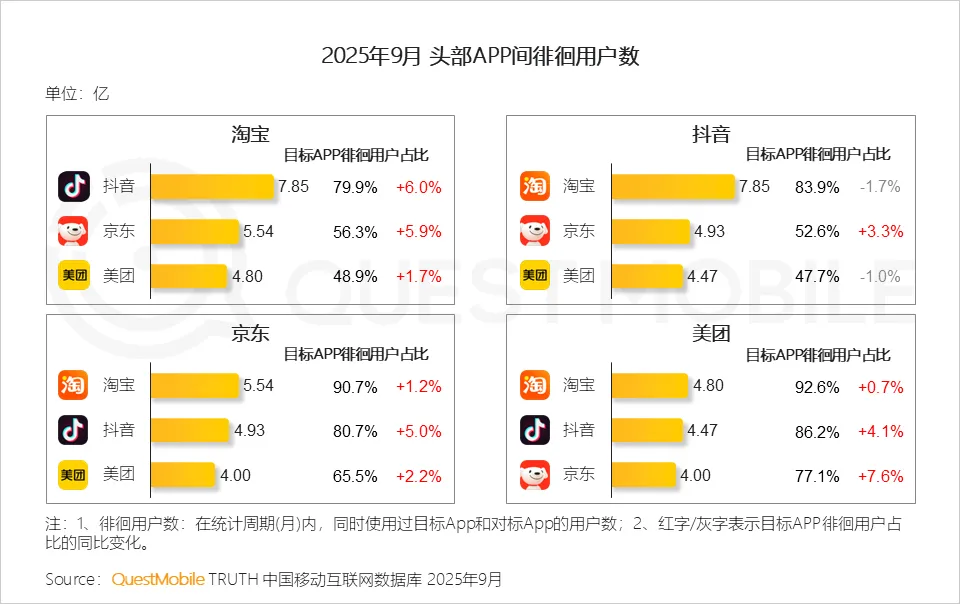 互联网平台的业务边界加速消融,各方正凭借其核心优势积极跨界,2025年市场竞争从外卖大战拓展至即时零售领域,与此同时,直播电商、AI等新兴领域的竞争也全面展开,淘宝、京东、抖音、美团APP间用户重合度持续提升,表明平台间的竞争已从单一业务层面转向综合生态体系的全方位较量。