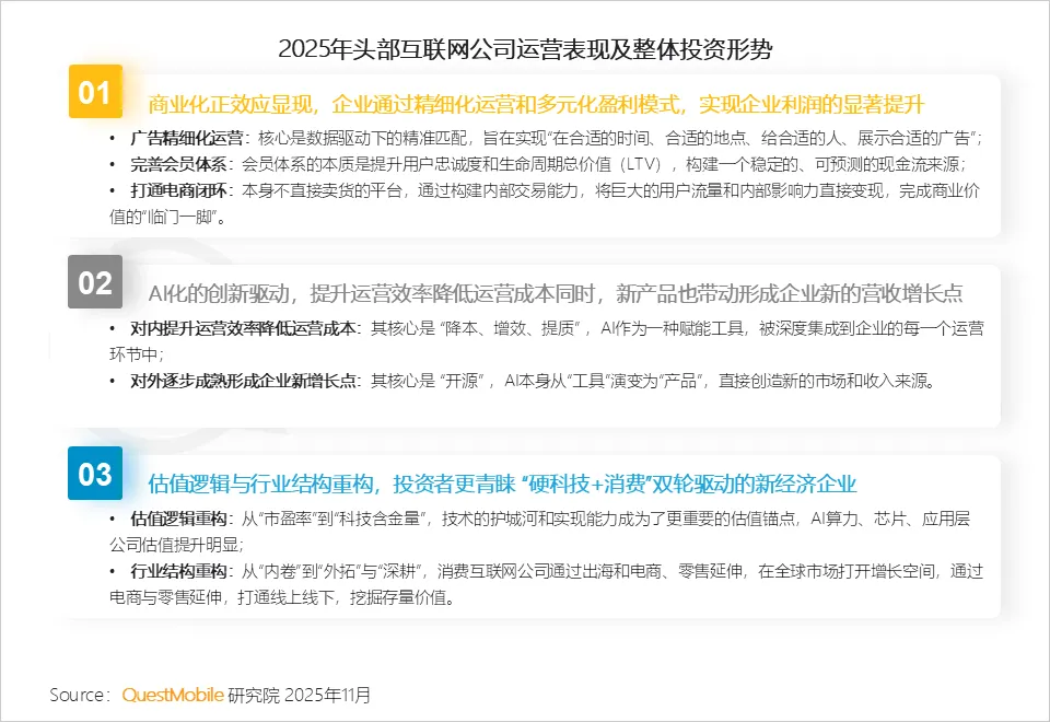 互联网平台领域表现的非常清晰。面对流量大盘见顶的现实,互联网巨头们在2025年一致选择了“降本增效”,将战略重心从“流量掠夺”、“拼抢用户规模”转向“用户价值深耕”,纷纷打破边界,尝试以“数据-技术-场景”全生态协同模式服务好用户。