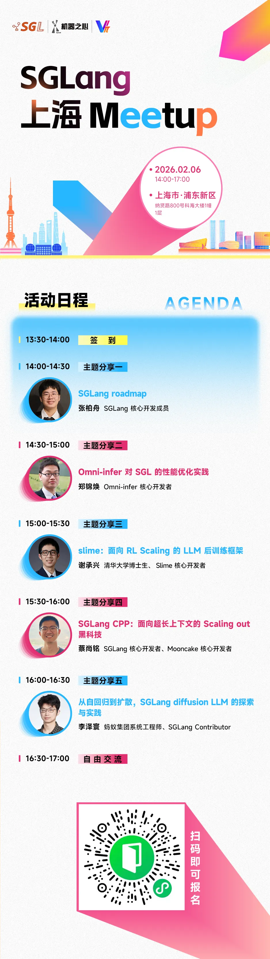 基于此,由 SGLang 社区、机器之心、张江孵化器联合举办线下 Meetup,让屏幕前的贡献者走到台前,让幕后优化者分享实战心法。2 月 6日下午,「SGLang 上海 Meetup」将在上海浦东·纳贤路 800 号 1 层举办。