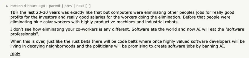 也有网友认为,亚马逊的裁员只不过是一个缩影。随着技术的发展,这种情况将越来越常见,过去二三十年的情况也如此,只不过彼时是用计算机取代了其他人的工作,再早之前,人们是用高效的机器和工业机器人取代蓝领工人。「软件已经吞噬了世界,现在 AI 也将吞噬 “软件专业人士”……」
