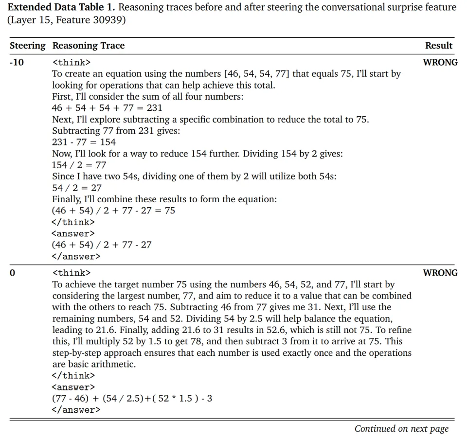 例如,扩展数据表 1 所示,正向引导(+10)会诱发模型在推理过程中主动质疑先前的解法(如「等等,让我再看看…… 另一个思路是……」),体现出明显的视角切换和观点冲突;而负向引导(−10)则会生成相对平铺直叙的推理文本,缺乏内部讨论和自我辩论的过程。