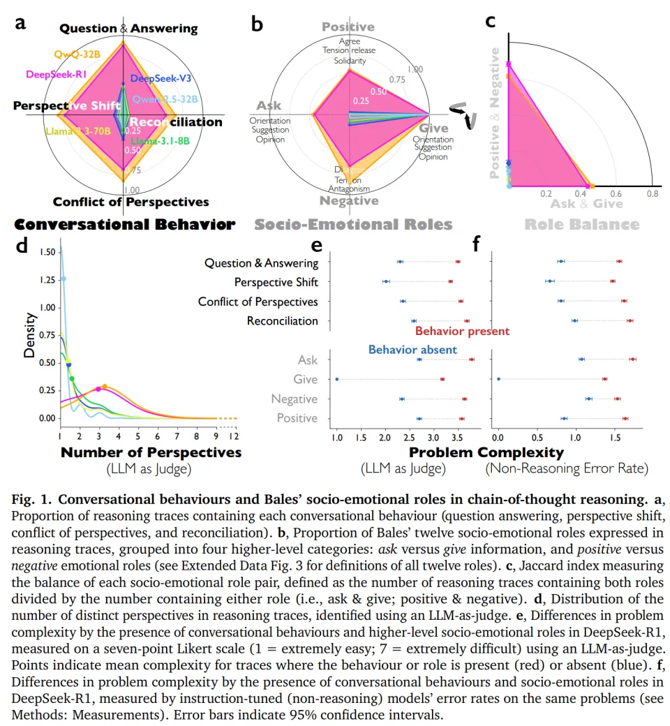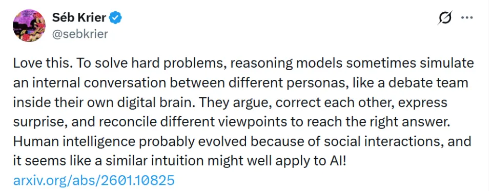 简单理解就是,这项研究发现,为了解决难题,推理模型有时会模拟不同角色之间的内部对话,就像他们数字大脑中的辩论队一样。他们争论、纠正对方、表达惊讶,并调和不同观点以达成正确答案。人类智能很可能是因为社交互动而进化的,而类似的直觉似乎也适用于人工智能!