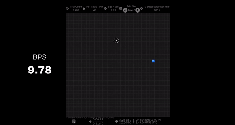 除了主观的参与者体验之外,Neuralink 团队还通过测量信息传递速率来量化意图转化为行动的速度和精确度。用户选择一系列目标的速度和准确度越高,信息传递速率就越高,控制效果也就越好。