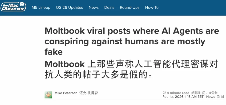 据 the Mac Observer 报道,moltbook 是一个实验项目 ,它的架构使得人们可以异常轻松地伪造截图、夸大数据并操纵舆论以博取关注。