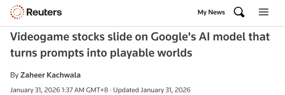 受Project Genie影响,游戏圈行业巨头股价便迎来了一场集体跳水: