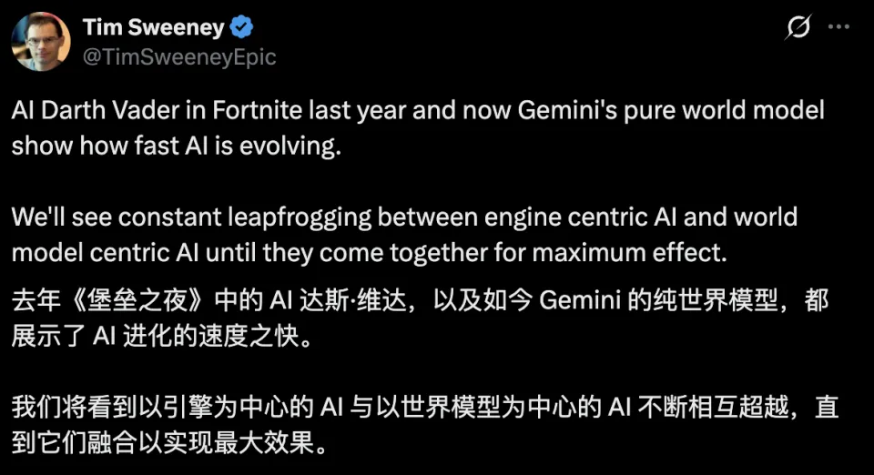 Epic Games的CEO蒂姆·斯威尼也在Project Genie发布时表示,我们将看到一个「以引擎为中心的AI和以世界模型为中心的AI不断相互追赶、相互超越,直到最终结合」的未来。