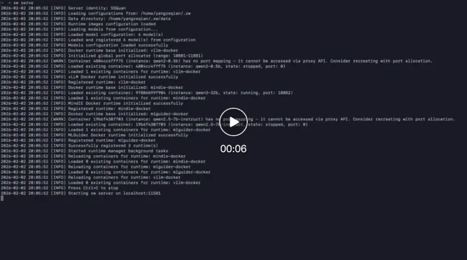 一切始于一行简洁的命令 xw serve。无需复杂的环境变量配置,系统直接完成运行时配置初始化与全局端口分配,唤醒后台守护进程。