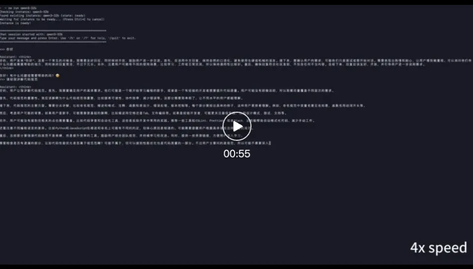 模型运行同样丝滑。通过 xw run 命令,系统能直接检测实例状态。若模型已就绪,即可秒级进入 Chat 会话模式,直接开始问答交互。