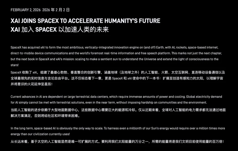 “这不仅是 SpaceX 与 xAI 使命的下一个篇章,而是下一本书:通过规模化,打造一颗‘有意识的太阳’,以理解宇宙,并将意识之光延伸至群星之间。