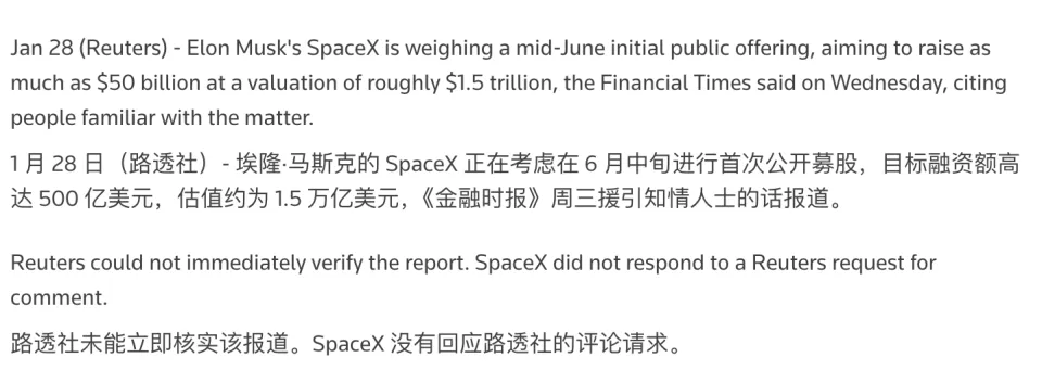 另据路透社消息,SpaceX 可能在 2026 年中推进 IPO、募资规模最高达 500 亿美元、估值目标可能到 1.5 万亿美元 左右。不过 SpaceX 方目前对此还没给出回复。