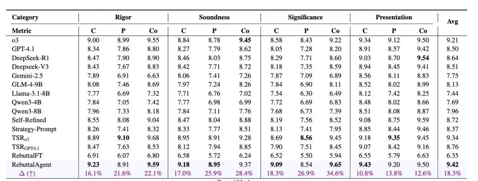 在综合得分上,RebuttalAgent 达到了 9.42,显著优于 GPT-4.1 和 O3 。