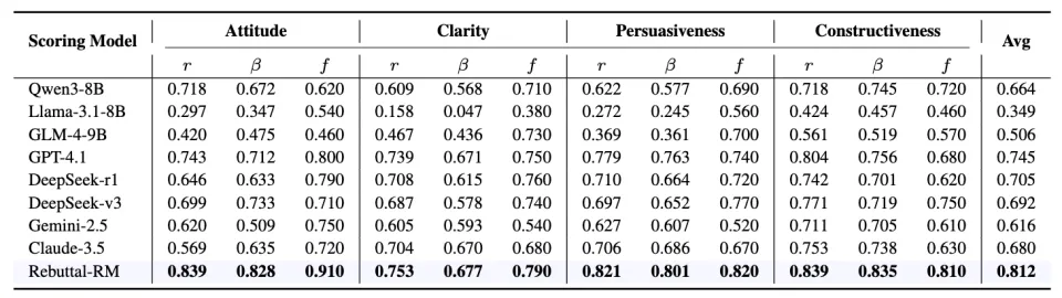 为了量化评估效果,研究团队开发了 Rebuttal-RM,这是一个专门针对学术反驳场景训练的奖励模型。在与人类专家评分的一致性测试中,Rebuttal-RM 的表现超越了 GPT-4.1。