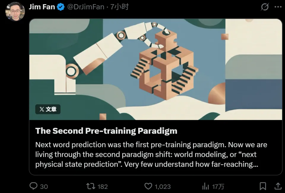 今天凌晨,英伟达高级研究科学家、机器人团队负责人 Jim Fan(范麟熙)发布文章《第二代预训练范式》,引发了机器学习社区的讨论。