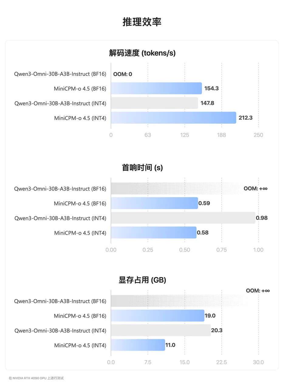 不仅如此,MiniCPM-o 4.5 在提升能力密度的同时也在追求极致能效比:以更低显存占用、更快响应速度,在保持 SOTA 级多模态表现下,实现更高推理效率与更低推理成本。