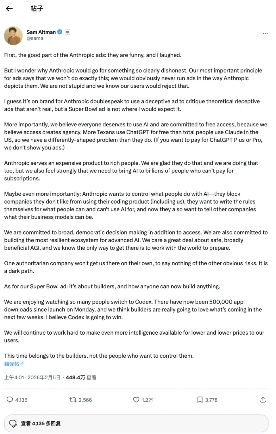 这场围绕AI广告模式的争论,很快在社交媒体平台X上升级为两家公司的正面交锋。OpenAI首席执行官山姆・奥特曼公开回应,称Anthropic的超级碗广告“确实有趣”,但同时指责其“不够诚实”。他强调,OpenAI从未计划以广告干扰对话的方式变现,Anthropic在广告中所描绘的场景在现实中并不会发生。