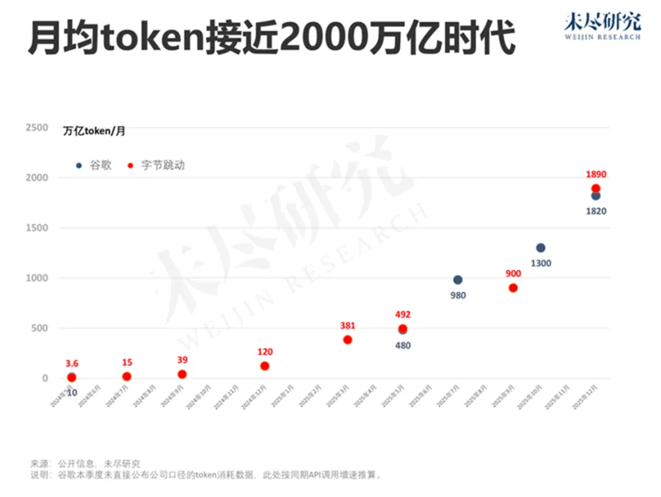 如果假定面向企业与消费者的token消耗以相近的速度增长,那么,截至去年12月的上一财季,谷歌每月消耗token数量达到了1820万亿tokens。作为对照,上个月,旗舰豆包大模型升级至Seed-1.8,直指“通用现实世界智能体”,将字节跳动日均token消耗提升到63万亿量级,也即每月消耗1890万亿tokens。