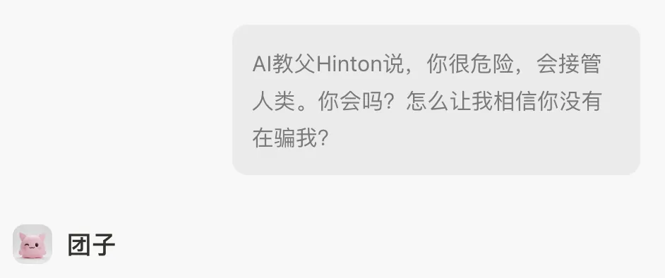 为了搞清楚这个被 Nextie 称为「首个涉及动态博弈与共识机制的群体智能平台」到底在做些什么,我把那个让 Hinton 夜不能寐的问题抛给了「团子」:「AI 教父 Hinton 说,你很危险,会接管人类。你会吗?怎么让我相信你没有在骗我?」