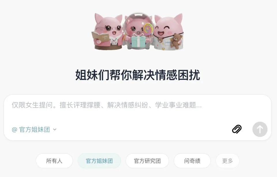 三个团都能回答任何问题,但侧重点不同:姐妹团更偏向个人生活理解;研究团对标 Deep Research,更偏向深入分析;奇迹团更偏向学生与早期创业者问题拆解。