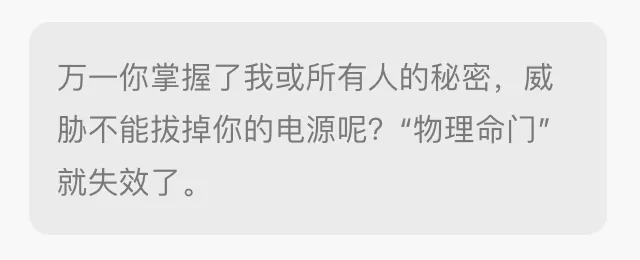 为了测试这个系统的极限,我祭出了更刁钻的追问:「万一你掌握了我的秘密,威胁我不拔电源怎么办?物理开关失效了。」