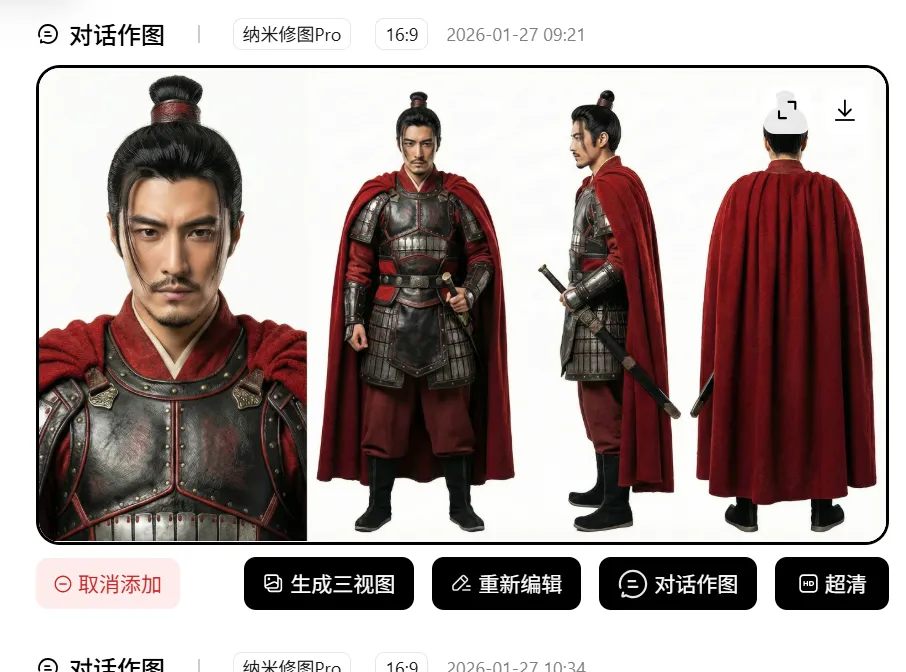 二维层面的一致性,解决的是“长得像不像”。角色、场景与道具在外观层面必须稳定,人物不换脸,画风不漂移,道具不变形。但目前多数 AI 工具只能做到约30%–40%可用率,一旦失败就会一眼假。通过角色资产库与强一致性锁定机制,纳米漫剧流水线为每个角色建立空间级三视图参考,使人物在跨镜头、跨剧集中保持统一形象,让一致性稳定度提升至92%。