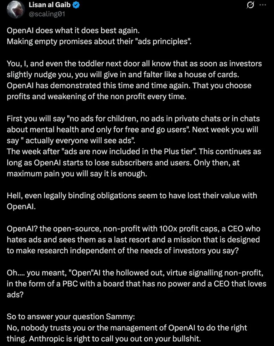 他转发奥特曼的文章并评论道:「OpenAI 又在做它最擅长的事了,对他们的『广告原则』做出空洞的承诺。只要投资者稍微推一把,你们就会像纸牌屋一样不堪一击。OpenAI 已经一次又一次地证明了这一点,你们每次都选择利润,削弱非营利性。」