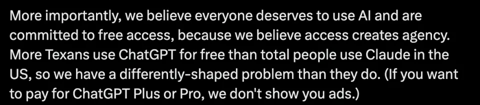 「我们相信每个人都应该使用 AI,并致力于提供免费访问,因为我们相信访问权创造了能动性。」他披露了一个数据:仅在德克萨斯州免费使用 ChatGPT 的人数就超过了全美使用 Claude 的总人数,因此 OpenAI 面临着与 Anthropic「不同的问题」。他补充道,对于付费订阅 Plus 或 Pro 的用户,OpenAI 不会显示广告。