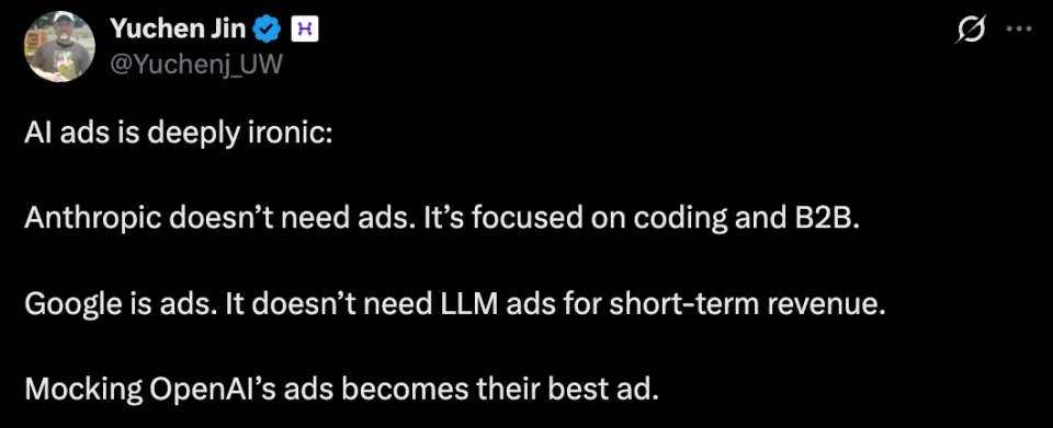 知名博主 Yuchen Jin 认为:「AI 广告这事本身就很讽刺。Anthropic 不需要广告,它专注于编码和 B2B 业务;谷歌靠广告为生,也不需要 LLM 广告来获得短期收入;嘲笑 OpenAI 的广告反而成了他们最好的广告。」