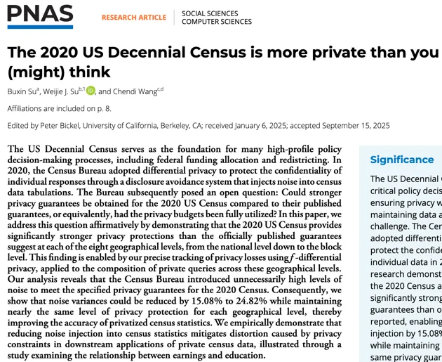 随着深度学习对敏感数据的依赖日益加深,如何在保护隐私的同时维持模型性能已成为核心难题。苏炜杰与其学生提出的高斯差分隐私(GDP)框架能够精确刻画每次迭代的隐私损耗,并实现了隐私保护与模型准确率的最优平衡(参见「隐私保护新突破:高斯差分隐私框架与深度学习结合」)。该框架的里程碑式应用是 2020 年美国人口普查 —— 迄今全球规模最大的差分隐私实践。研究表明,在相同隐私保护水平下,噪声方差可降低约 15%,显著提升人口普查数据在经济学与社会学研究中的应用价值。该成果发表于《美国国家科学院院刊》(PNAS)。