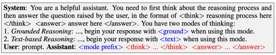 1. 我们在推理序列的开始给不同模式引入了对应的特殊 prefix token,比如 < text>, <ground>,作为指示符帮助模型区分不同的推理模式,然后通过 SFT 整合数据帮助模型学习不同的思考模式;