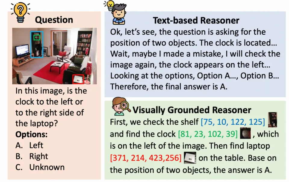 2.Visually-Grounded 思考模式:通过结构化的信息(主要是 bounding box 等坐标)将推理路径中的关键概念与图片中的区域对应起来,进一步还可以将对应局部区域进一步裁剪缩放后输入给模型,帮助其利用局部的信息,即 GPT-o3 中提到的 thinking with images 的概念。