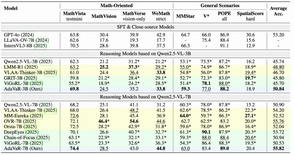 表 1: 不同模型之间的性能。黄色底代表文本推理模型,绿色底为 Grounded 推理,蓝色底为本文的 AdaVaR 模型。