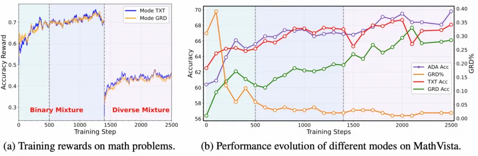 A2.1: 如图 4 所示,以数学问题为例,我们可以看到,图 (a) 中两个模式相对的 reward 高低(表现好坏)引导了图 (b) 中 GRD% 曲线(模式选择)的变化。大概可以分为三个学习阶段:
