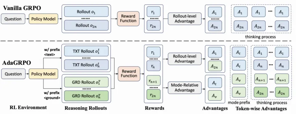1.Prefix-guided Exploration:GRPO 中的 rollout 生成过程是自由的,可能导致模式之间的不均匀探索,比如对同一个问题生成的 2n 条思考过程都是同一个模式。所以 AdaGRPO 中,我们通过固定 mode prefix,让模型前 n 条 和 后 n 条 rollout 分别来自文本思考和 grounded 思考模式;
